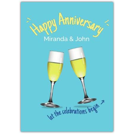 Celebrate love and togetherness with this charming Anniversary Champagne Glasses Greeting Card. Featuring two elegant champagne flutes raised in a cheerful toast against a vibrant turquoise background, this card perfectly captures the joy and sparkle of a special anniversary.