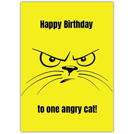 Brighten up a birthday with this cheeky and humorous card featuring a grumpy cat face and the playful message, “Happy Birthday to one angry cat!” The bold yellow background and sassy design make it a standout choice for anyone who loves cats or appreciates a good laugh.