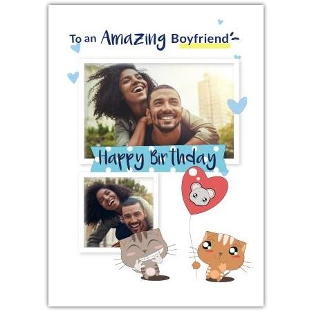 Celebrate your boyfriend’s special day with this charming and playful birthday card, featuring adorable cats and a cute heart-shaped balloon. The white background highlights two photo frames where you can add your favourite pictures together, making the card truly personalised and heartfelt.