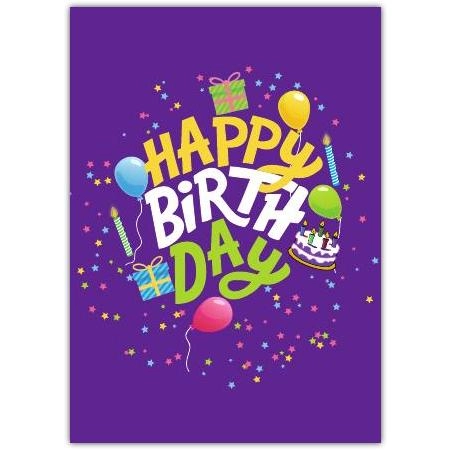 This lively birthday greeting card features a vibrant purple background adorned with cheerful balloons, festive presents, a birthday cake, and sparkling stars. The playful and bold "Happy Birthday" typography in bright yellow, white, and green instantly lifts the spirits and brings a smile to anyone's face.