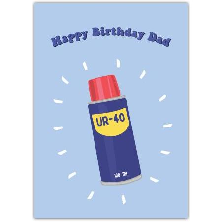 This charming card features a playful illustration of a sunscreen bottle labelled “UR-40” on a soft blue background, with the greeting “Happy Birthday Dad” boldly displayed above. It’s a clever and sweet nod to caring for dad while adding a touch of humour.