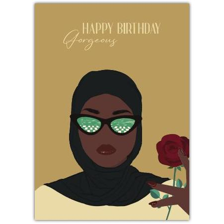 Send your warmest wishes with this elegant Happy Birthday Gorgeous greeting card, featuring a striking illustration of a confident woman wearing a chic hijab and stylish sunglasses, holding a vibrant red rose. The sophisticated design and warm colour palette make this card a perfect choice for anyone who appreciates bold, modern art and heartfelt messages.
