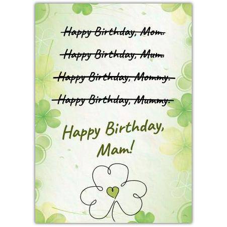 Celebrate your Irish Mam’s special day with this charming and heartfelt birthday card. Featuring a delightful design of crossed-out variations of “Happy Birthday” before finally settling on the warm and loving “Happy Birthday, Mam!” – this card perfectly captures the unique bond and affection shared with your mother.