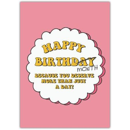 Brighten the birthday celebrations with this charming greeting card featuring a bold, retro-inspired message: “Happy Birthday Month - Because You Deserve More Than Just a Day!” Set against a cheerful pink background with warm yellow lettering, this card perfectly captures the joy and excitement of extending birthday wishes beyond just one day.