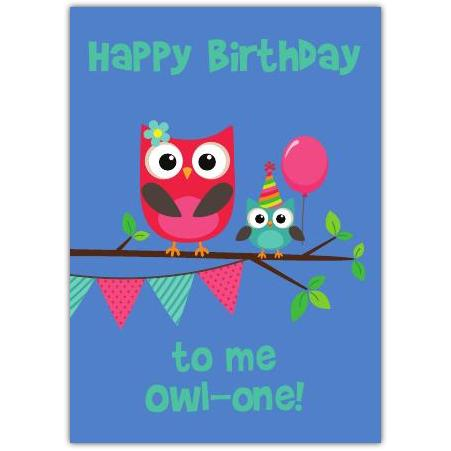 This delightful birthday card features two adorable owls perched on a leafy branch against a vibrant blue background. The bigger owl sports a cute flower, while the smaller one beams in a party hat beside a bright pink balloon. Cheerful bunting adds an extra festive feel to the design. The playful pun, "Happy Birthday to me owl-one!", is sure to bring a smile to anyone’s face.
