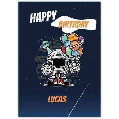 - Space-themed fun: Featuring a charming astronaut holding colourful planet-shaped balloons against a starry night sky, this card captures the magic of outer space.