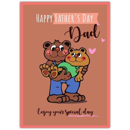Celebrate the special bond between father and child with this heartwarming Father's Day card. Featuring an adorable illustration of two bears embracing, this charming design perfectly captures the love and warmth shared between a dad and his son.