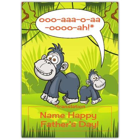 Celebrate Father's Day with a playful twist using this charming Happy Father's Day Little Monkey Card. Featuring two delightful cartoon monkeys set in a vibrant jungle backdrop, this card brings fun and warmth to your special message. The cheeky speech bubble filled with monkey "language" adds a humorous touch, perfectly translating into a heartfelt Father's Day greeting.