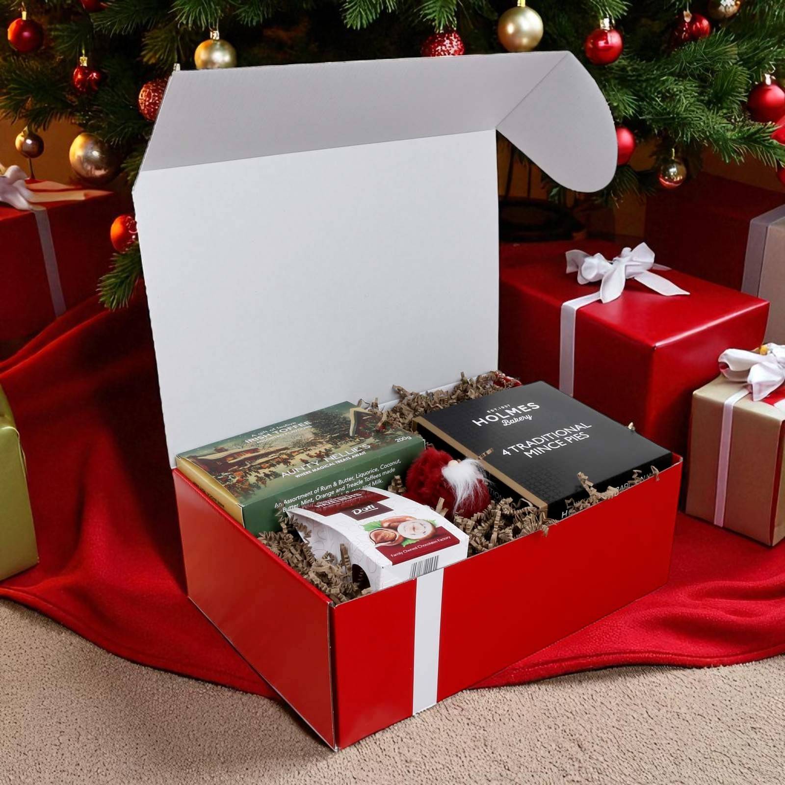 The hamper is presented in our new red gift box. Stylish and reusable, the gift box is packed inside a separate shipping box for secure transport.