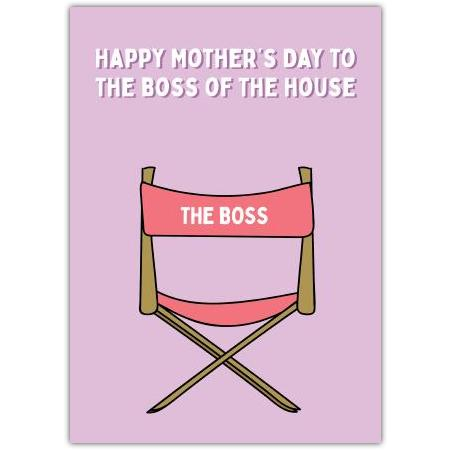 This charming greeting card is perfect for the ultimate "Boss of the House." Featuring a playful illustration of a director's chair labelled "The Boss" on a soft lilac background, it's a fun and affectionate way to honour the amazing mum who runs the show at home.