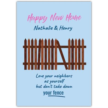 This charming Happy New Home Fence Card is the perfect way to congratulate friends or family on moving into their new home. Featuring a warm blue background and a rustic wooden fence illustration, this card combines a heartfelt message with a cheeky twist: