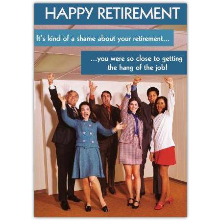 This Happy Retirement card brings a light-hearted and fun message perfect for anyone retiring from their job. Featuring a cheerful group of colleagues celebrating, the card reads: "It's kind of a shame about your retirement... you were so close to getting the hang of the job!" – a playful nod to all the memories and experiences gained over the years.