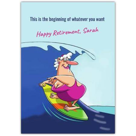 Celebrate a Bold New Chapter with the Happy Retirement Woman Surfs Up Greeting Card!