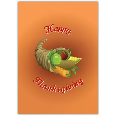 This charming Thanksgiving card features a classic cornucopia overflowing with vibrant fruit and vegetables, perfectly capturing the autumnal spirit of the season. The warm orange background and elegant red lettering saying "Happy Thanksgiving" make it a heartfelt way to share your thanks and good wishes.
