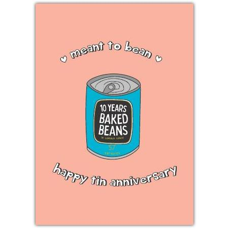 This charming greeting card is perfect for couples marking their 10th wedding anniversary, traditionally known as the "tin" or "aluminium" anniversary. Featuring a playful illustration of a can of baked beans, it cleverly combines humour and warmth with the phrases "meant to bean" and "happy tin anniversary".