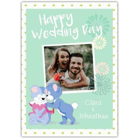 Celebrate a special wedding day with this charming Happy Wedding Day Photo Upload Green Hearts Card. Featuring adorable blue rabbits and delicate floral motifs on a soft green background, this card beautifully combines cuteness and elegance.