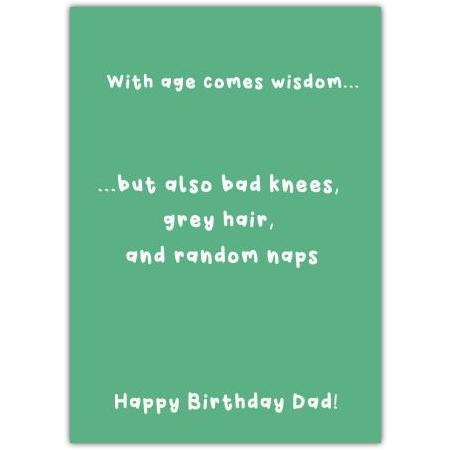 This card features a playful message that reads: "With age comes wisdom... but also bad knees, grey hair, and random naps. Happy Birthday Dad!" It’s the perfect way to bring a smile to your father’s face and celebrate his birthday with warmth and wit.