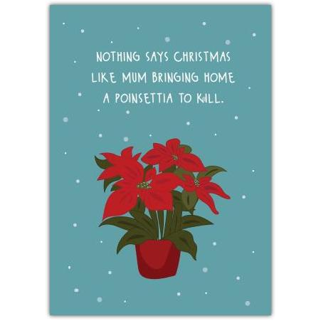 Featuring a playful illustration of a bright red poinsettia plant against a snowy blue background, this card is perfect for anyone who loves a bit of Christmas fun. The witty message, "Nothing says Christmas like Mum bringing home a poinsettia to kill," adds a lighthearted, relatable touch that will bring a smile to the recipient’s face.