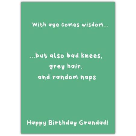 This charming birthday card features a witty message that perfectly captures the joys and quirks of getting older: “With age comes wisdom... but also bad knees, grey hair, and random naps.” It’s an endearing and light-hearted way to bring a smile to your grandad’s face on his birthday.