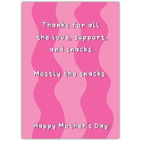 This charming card features a playful message that says, "Thanks for all the love, support, and snacks. Mostly the snacks." set against a cheerful pink wavy background, making it the perfect way to show your appreciation with a touch of humour.