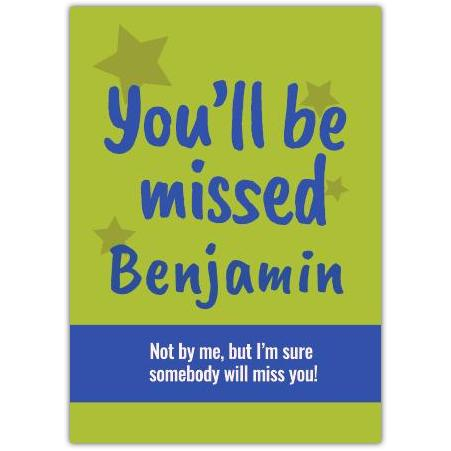 - Funny yet warm message: "You'll be missed Benjamin – Not by me, but I'm sure somebody will miss you!" adds a humorous twist to farewell wishes.