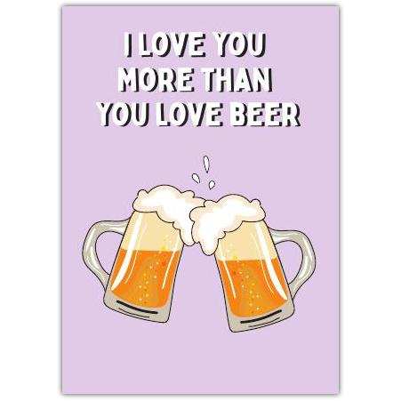 Show your love with a touch of humour! This delightful "I Love You More Than You Love Beer" greeting card is perfect for those who want to express their feelings with a fun twist. Featuring two frothy beer mugs clinking together on a cheerful purple background, this card is a charming way to say "I love you" to a partner, friend, or family member who enjoys a good pint.