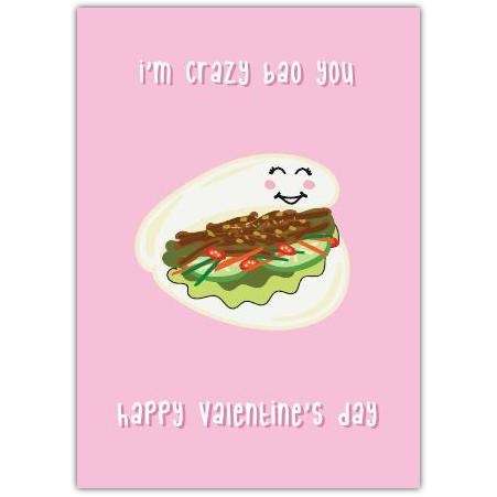 Crazy Bao You Valentines Day Greeting Card is a fun and playful way to express your love this Valentine's Day. Featuring a cute, smiling bao bun filled with delicious ingredients, this card combines humour and affection with the clever pun "I'm crazy bao you."