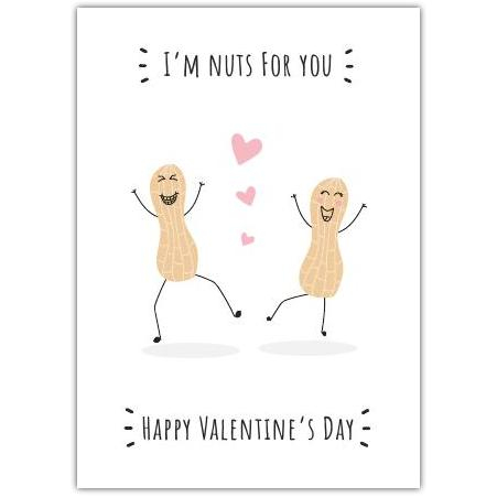 This charming card features two happy, dancing peanuts alongside the cheeky message, "I'm nuts for you", making it a perfect way to express your affection with humour and heart. The simple yet delightful design is completed with little pink hearts and a warm "Happy Valentine's Day" greeting.