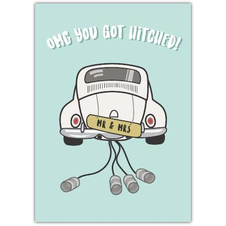 Celebrate the joyous union with this charming wedding card! Featuring a classic car with a "Mr & Mrs" number plate and vintage tin cans trailing behind, this delightful design perfectly captures the fun and tradition of tying the knot.