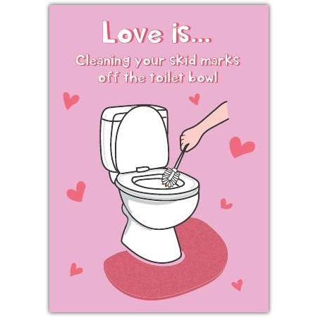 Love is… Cleaning your skid marks off the toilet bowl – a cheeky and humorous greeting card that brings a playful twist to the quirks of love and relationships.