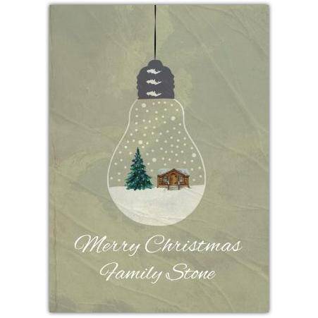 Celebrate the magic of the festive season with this charming Merry Christmas Snowglobe Bulb Greeting Card. Featuring a unique design of a cosy cabin and a snow-covered pine tree inside a glowing lightbulb, this card beautifully captures the warmth and wonder of Christmas. The subtle snowfall adds a touch of gentle winter enchantment, making it a perfect way to send heartfelt holiday wishes.