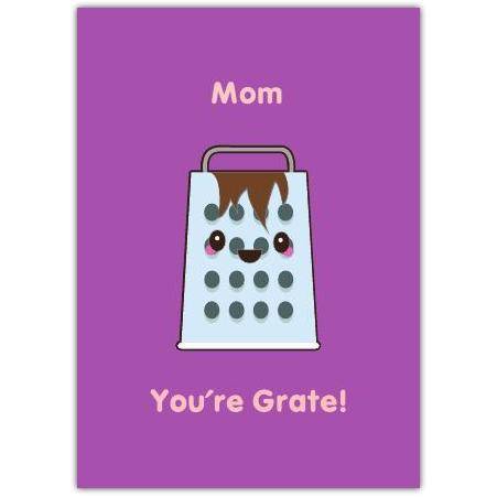 Celebrate your mum with a dash of humour and a pinch of charm! This fun and playful greeting card features an adorable cheese grater illustration with a cute, smiling face, accompanied by the witty pun: "Mom, You're Grate!" set against a vibrant purple background. Perfect for mums who enjoy a good laugh and appreciate kitchen-themed humour, this card is sure to bring a smile to her face.