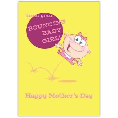 This charming greeting card features a vibrant yellow background and an adorable cartoon illustration of a bouncing baby girl, capturing a playful and joyful spirit. The humorous design, with its bright pink and cheerful graphics, perfectly conveys the energetic love and affection from daughter to mother.