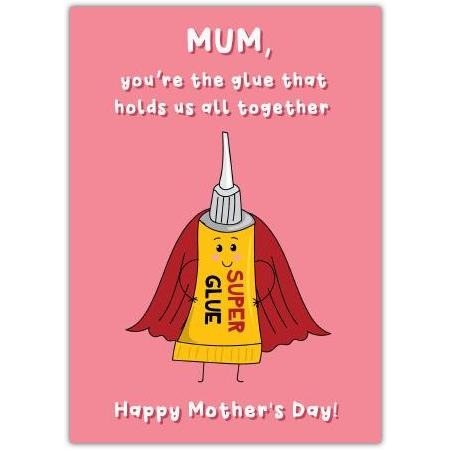 This cheerful and heartfelt greeting card shows your Mum just how much she means to you. Featuring a cute illustration of a "Super Glue" tube wearing a cape, this card perfectly captures the important role Mum plays as the glue that holds the family together.