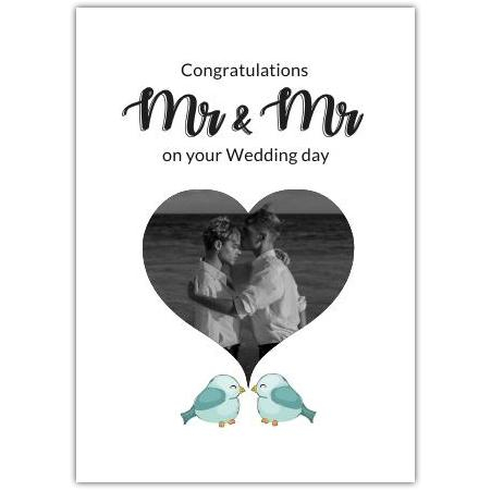 Mr and Mr Wedding Day Congratulations Card with Heart Photo and Bluebirds Design