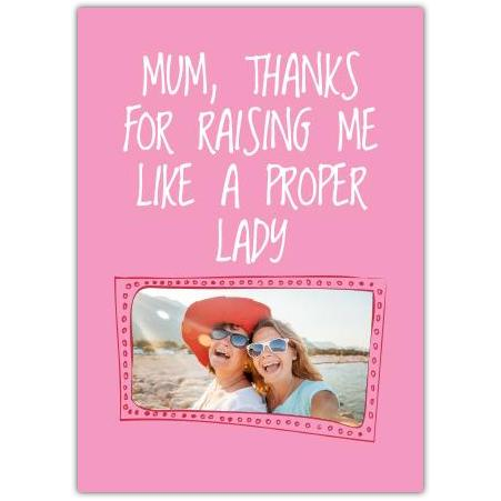 This charming pink greeting card is the perfect way to say, "Mum, thanks for raising me like a proper lady." Featuring a playful design and space for a personalised photo on the cover, it’s a wonderful choice to celebrate your mum’s love, humour, and guidance.