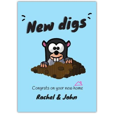 Featuring a delightful mole popping out of the earth against a bright blue background, this card brings a playful and cheerful vibe to any new home celebration. The bold "New digs" message on the front perfectly captures the excitement of moving into a new place, while the personalised touch of names adds warmth and meaning.