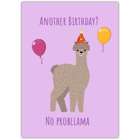 Bring a smile to someone's special day with this adorable No Prob-llama birthday card! Featuring a charming llama wearing a festive party hat against a cheerful purple background, accented with colourful balloons, this card delivers a playful pun that’s both fun and lighthearted.