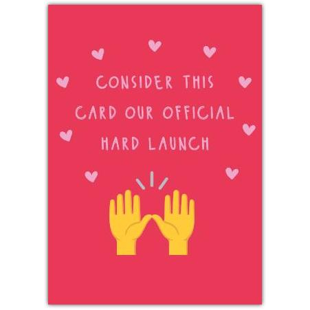 This vibrant and playful greeting card features the cheeky message, "Consider This Card Our Official Hard Launch," surrounded by cute pink hearts and celebratory raised hands emojis. Perfect for marking exciting milestones, whether you're announcing a new job, a new relationship, or simply a fresh chapter in life.