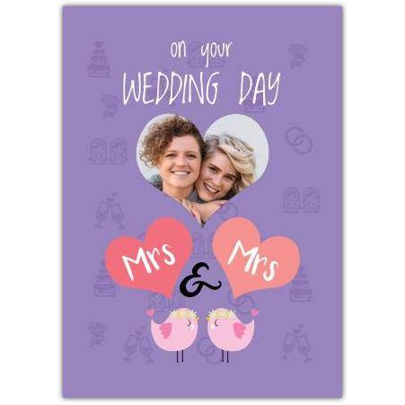 This charming wedding card is a heartfelt way to honour a special marriage between two wonderful women. Featuring a warm purple background adorned with delicate wedding-themed illustrations and two adorable birds holding heart-shaped balloons, this design radiates joy and celebration. The personalised photo space in the centre allows you to add a memorable picture of the happy couple, making it truly unique and personal.