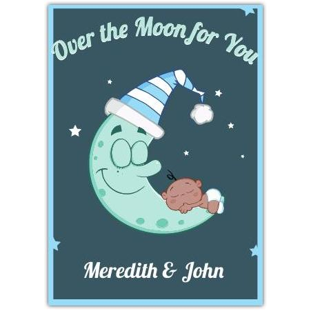 Celebrate your precious new arrival with this charming 'Over The Moon For You' Baby Card.