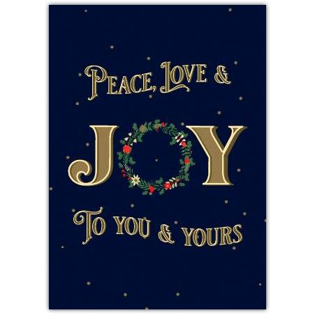 Send heartfelt wishes this festive season with our beautifully designed greeting card, featuring the uplifting message: "Peace, Love & Joy To You & Yours". Set against a rich, deep navy background, the shimmering gold lettering and delicate holiday wreath create a timeless and sophisticated look that captures the magic of Christmas.