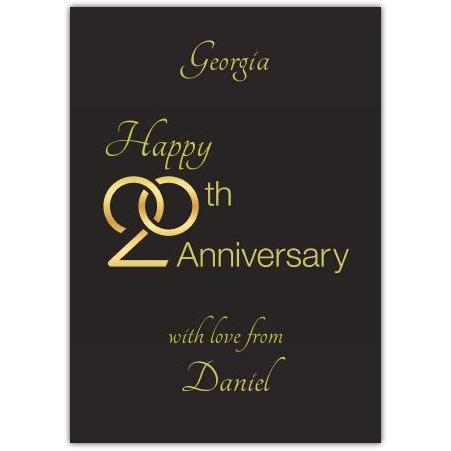 Mark this special milestone with a beautifully elegant 20th anniversary card. Featuring a sleek black background with shimmering gold lettering and interlocking rings, this card conveys timeless love and commitment. Personalised with names and a heartfelt message, it adds a truly unique and thoughtful touch to your anniversary wishes.