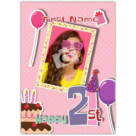 Personalised 21st Birthday Card with Cake Balloons and Photo Frame on Pink Background