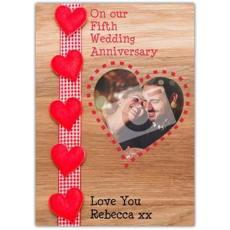 Personalised 5th Wedding Anniversary Card with Wooden Heart Photo Design and Red Hearts
