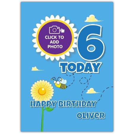 This delightful card features a vivid blue background adorned with a sunny flower and a playful bee, making it perfect for celebrating the big day of any 6-year-old. The bold number "6" and "Today" highlight the wonderful milestone, while the "Happy Birthday" greeting can be customised with the recipient’s name for a truly personal touch.
