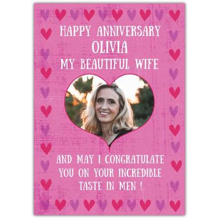 This charming card features a warm pink background adorned with sweet red and purple hearts, setting a romantic and playful tone. The heartfelt message reads, "Happy Anniversary [Name] My Beautiful Wife And May I Congratulate You On Your Incredible Taste In Men!", making it a delightful way to show your affection and sense of humour.