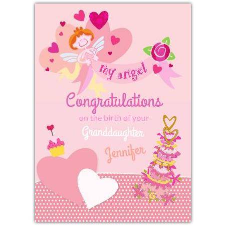Celebrate the joyous arrival of a new granddaughter with this charming pink greeting card. Featuring a delightful angel surrounded by hearts, a whimsical cake, and soft pastel tones, this card beautifully conveys warm wishes for a precious new baby.