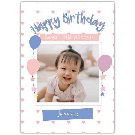 Happy Birthday Photo Pastel Balloon Greeting Card is the perfect way to celebrate the special day of your little princess. Featuring sweet pastel balloons, delicate hearts, and charming stars, this card combines a soft colour palette of pinks, blues, and white to create a gentle and joyful birthday greeting.