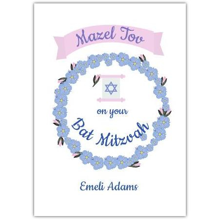 This charming Bat Mitzvah card features a delicate floral frame in soft blue, surrounding a traditional Star of David and a scroll motif, all beautifully complemented by touches of pink for a gentle, joyful look. The banner with "Mazel Tov" adds a heartfelt congratulatory message, perfect for marking this important milestone in a young girl's life.